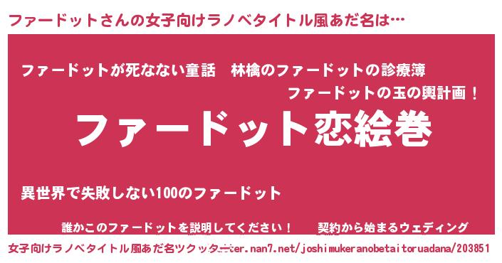 ファードットさんの女子向けラノベタイトル風あだ名は… 『ファードット恋絵巻』『ファードットが死なない童話 林檎のファードットの診療簿』『誰かこのファードットを説明してください! ~契約から始まるウェディング~』 ツクッター #女子向けラノベタイトル風あだ名ツクッター http://tkutter.nan7.net/joshimukeranobetaitoruadana/203851/