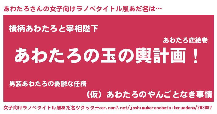 | 男性向けラノベタイトル風あだ名 | 『あわたろ~年齢イコール彼女いない歴の魔法使い~』 |