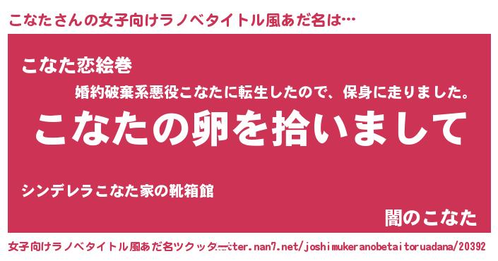 | 男性向けラノベタイトル風あだ名 | 『こなたの嫁は女の子じゃないと思った?』 |