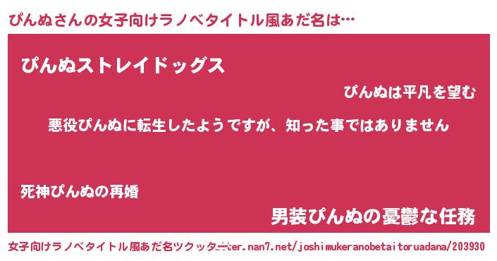 | 男性向けラノベタイトル風あだ名 | 『この素晴らしい世界にぴんぬを!』 |