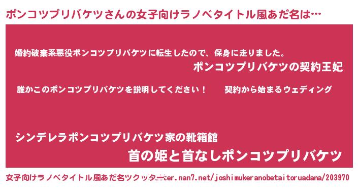 | 男性向けラノベタイトル風あだ名 | 『ポンコツプリバケツアートオンライン』 |