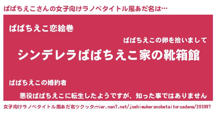 | 男性向けラノベタイトル風あだ名 | 『冴えないばばちえこの育てかた』 |