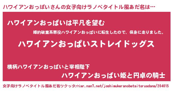 | 男性向けラノベタイトル風あだ名 | 『Re:ハワイアンおっぱいから始める異世界生活』 |
