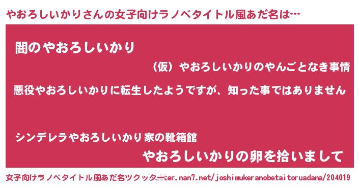 | 男性向けラノベタイトル風あだ名 | 『この素晴らしい世界にやおろしいかりを!』 |