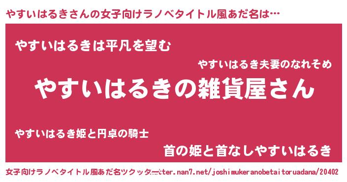 | 男性向けラノベタイトル風あだ名 | 『やはりやすいはるきの青春ラブコメはまちがっている 』 |