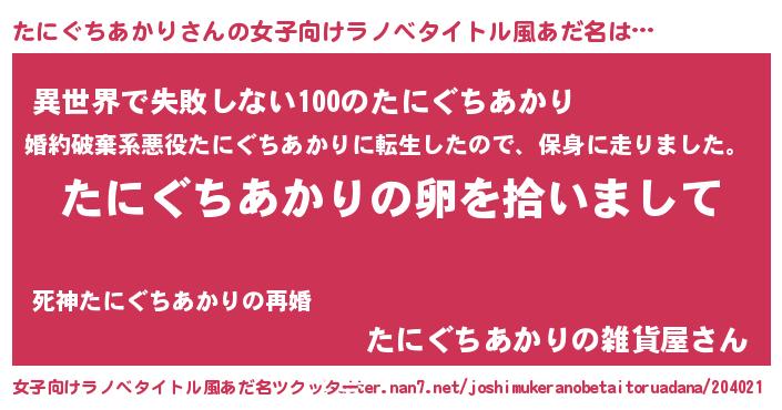 | 男性向けラノベタイトル風あだ名 | 『ダンジョンにたにぐちあかりを求めるのは間違っているだろうか』 |