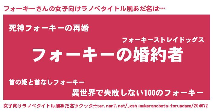 | 男性向けラノベタイトル風あだ名 | 『うちの娘の為ならば、俺はもしかしたらフォーキーも倒せるかもしれない。』 |