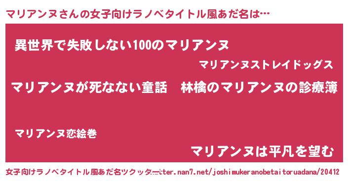 | 男性向けラノベタイトル風あだ名 | 『魔弾の王とマリアンヌ』 |