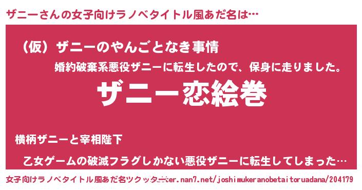 ザニーさんの女子向けラノベタイトル風あだ名は… 『ザニー恋絵巻』『(仮)ザニーのやんごとなき事情』『乙女ゲームの破滅フラグしかない悪役ザニーに転生してしまった…』 ツクッター #女子向けラノベタイトル風あだ名ツクッター http://tkutter.nan7.net/joshimukeranobetaitoruadana/204179/