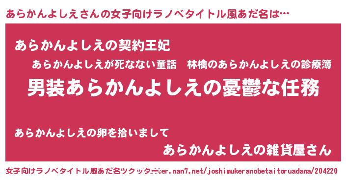| 男性向けラノベタイトル風あだ名 | 『うちのあらかんよしえが世界を掌握している!』 |