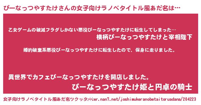 | 胡散臭い通販商品みたいなあだ名 | 『世界中を虜にした100年もののヴィンテージワイン…その名も「ぴーなっつやすたけ」』 |