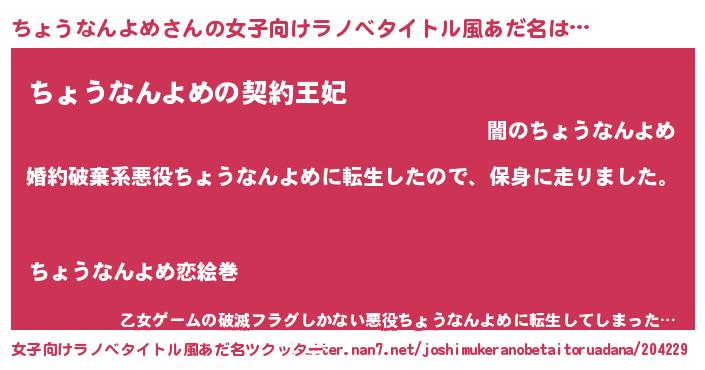 | 男性向けラノベタイトル風あだ名 | 『チョウナンヨメスレイヤー』 |
