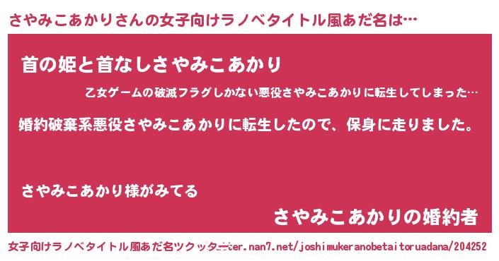 | 男性向けラノベタイトル風あだ名 | 『サヤミコアカリスレイヤー』 |