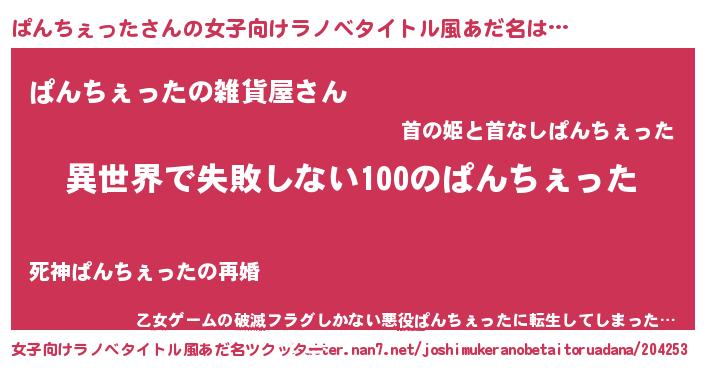 | 男性向けラノベタイトル風あだ名 | 『ぱんちぇったという概念が存在しない退屈な世界 』 |