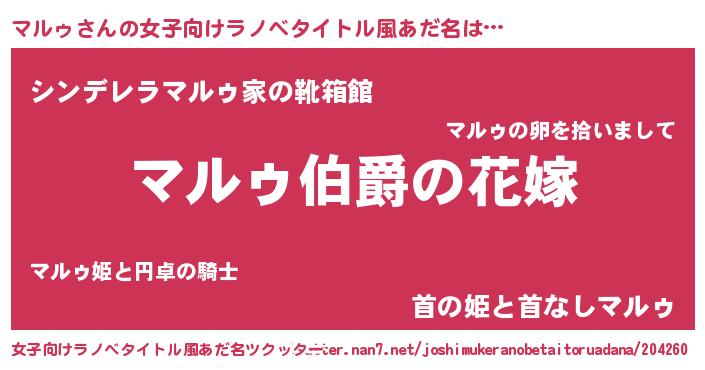 | 男性向けラノベタイトル風あだ名 | 『うちの娘の為ならば、俺はもしかしたらマルゥも倒せるかもしれない。』 |