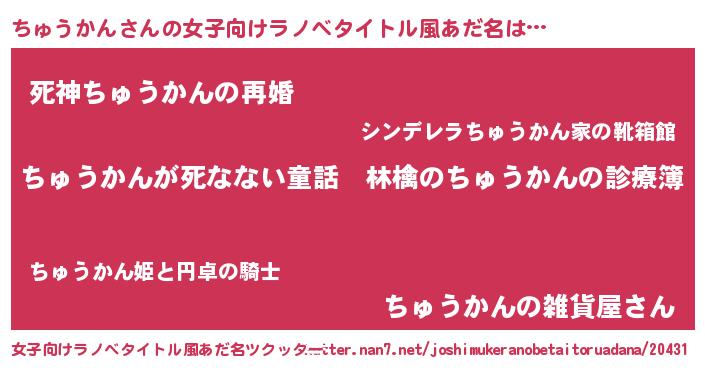 | 胡散臭い通販商品みたいなあだ名 | 『ハリウッド女優が絶賛した100年もののヴィンテージワイン…その名も「ちゅうかん」』 |