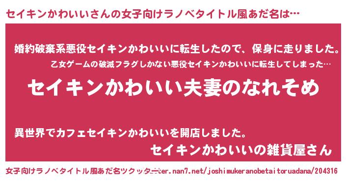 | 男性向けラノベタイトル風あだ名 | 『おまえをオタクにしてやるから、俺をセイキンかわいいにしてくれ! 』 |