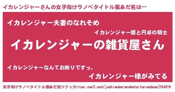 イカレンジャーさんの女子向けラノベタイトル風あだ名は… 『イカレンジャーの雑貨屋さん』『イカレンジャー夫妻のなれそめ』『イカレンジャー様がみてる』 ツクッター #女子向けラノベタイトル風あだ名ツクッター http://tkutter.nan7.net/joshimukeranobetaitoruadana/204319/