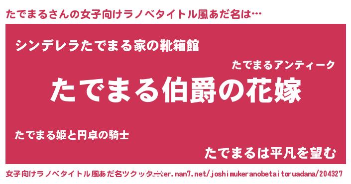 たでまるさんの女子向けラノベタイトル風あだ名は… 『たでまる伯爵の花嫁』『シンデレラたでまる家の靴箱館』『たでまるは平凡を望む』 ツクッター #女子向けラノベタイトル風あだ名ツクッター http://tkutter.nan7.net/joshimukeranobetaitoruadana/204327/