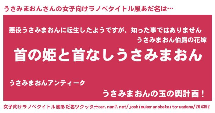 うさみまおんさんの女子向けラノベタイトル風あだ名は… 『首の姫と首なしうさみまおん』『悪役うさみまおんに転生したようですが、知った事ではありません』『うさみまおんの玉の輿計画!』 ツクッター #女子向けラノベタイトル風あだ名ツクッター http://tkutter.nan7.net/joshimukeranobetaitoruadana/204392/