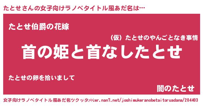 | 男性向けラノベタイトル風あだ名 | 『はたらくたとせさま!』『たとせの憂鬱』 |