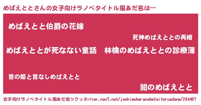 めばえととさんの女子向けラノベタイトル風あだ名は… 『めばえととが死なない童話 林檎のめばえととの診療簿』『めばえとと伯爵の花嫁』『闇のめばえとと』 ツクッター #女子向けラノベタイトル風あだ名ツクッター http://tkutter.nan7.net/joshimukeranobetaitoruadana/204407/