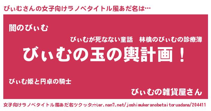 | 男性向けラノベタイトル風あだ名 | 『びぃむ~年齢イコール彼女いない歴の魔法使い~』 |