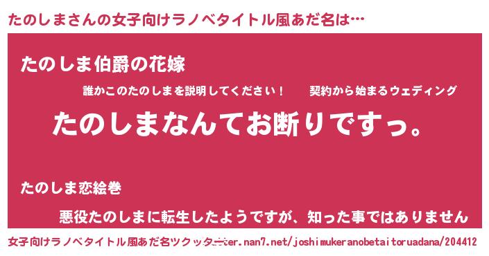 | 意味不明あだ名 | 『自称たのしま』『たのしまフォーエバー』 |
