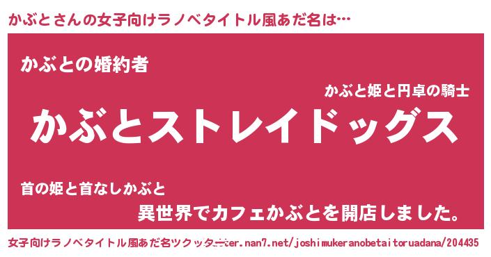 | 男性向けラノベタイトル風あだ名 | 『Re:かぶとから始める異世界生活』 |
