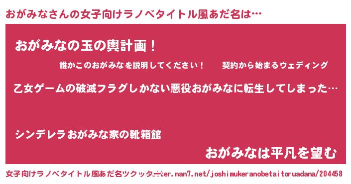 | 男性向けラノベタイトル風あだ名 | 『この素晴らしい世界におがみなを!』 |
