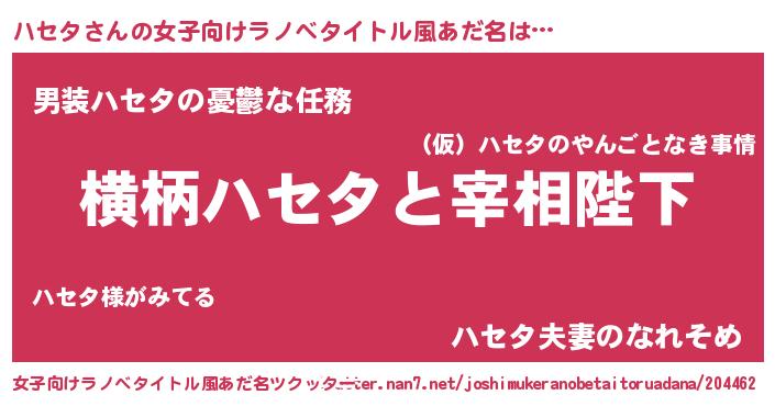 ハセタさんの女子向けラノベタイトル風あだ名は… 『横柄ハセタと宰相陛下』『男装ハセタの憂鬱な任務』『ハセタ夫妻のなれそめ』 ツクッター #女子向けラノベタイトル風あだ名ツクッター http://tkutter.nan7.net/joshimukeranobetaitoruadana/204462/