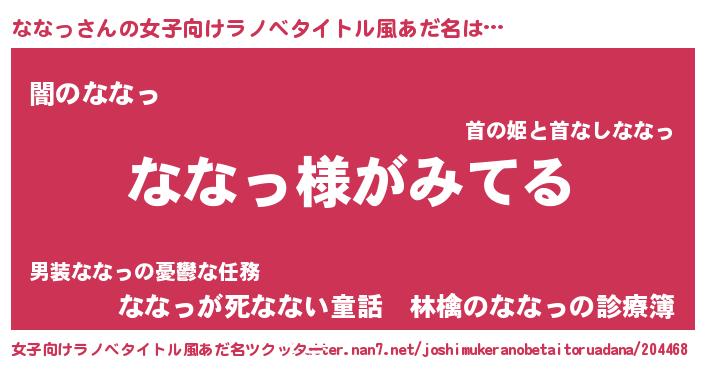 | 男性向けラノベタイトル風あだ名 | 『ななっの嫁は女の子じゃないと思った?』 |