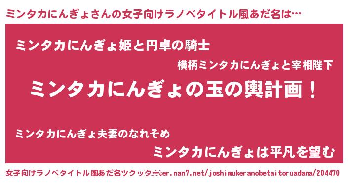 | 男性向けラノベタイトル風あだ名 | 『ミンタカにんぎょ~年齢イコール彼女いない歴の魔法使い~』 |