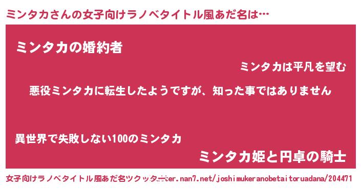 | 男性向けラノベタイトル風あだ名 | 『この素晴らしい世界にミンタカを!』 |