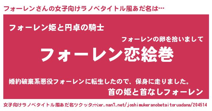 | 男性向けラノベタイトル風あだ名 | 『ノーゲーム・ノーフォーレン』 |
