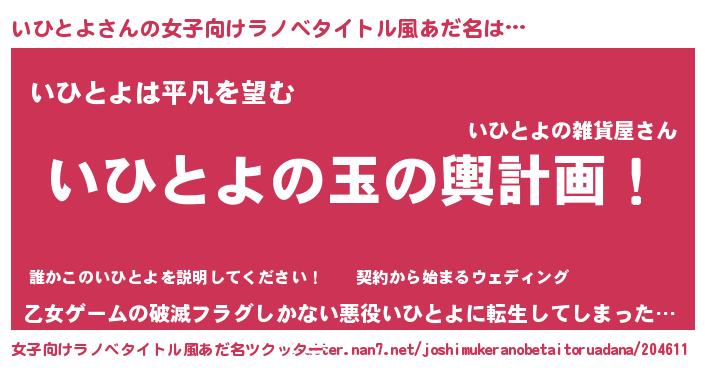 | 男性向けラノベタイトル風あだ名 | 『いひとよ~年齢イコール彼女いない歴の魔法使い~』 |