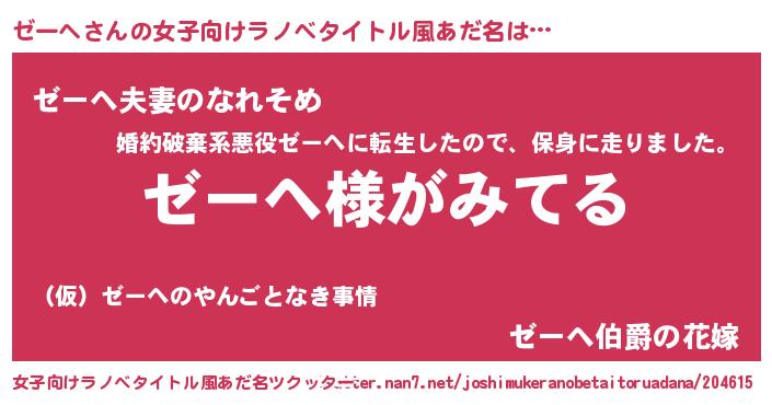 | 男性向けラノベタイトル風あだ名 | 『ゼーヘの嫁は女の子じゃないと思った?』 |