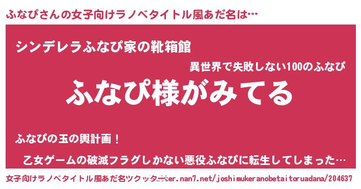 | 男性向けラノベタイトル風あだ名 | 『ふなぴの嫁は女の子じゃないと思った?』 |