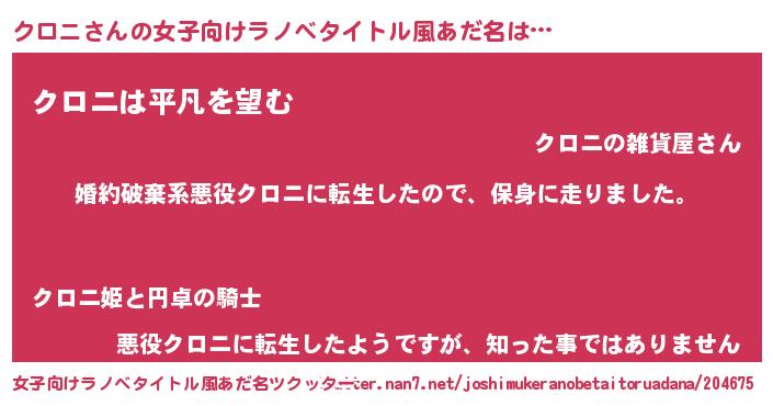 | 料理風あだ名 | 『クロニごはん』『クロニの豆乳スープ』 |
