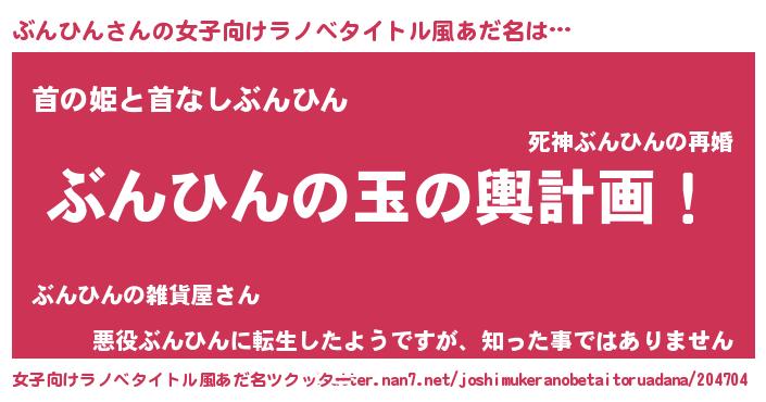 男性向けラノベタイトル風あだ名 | 『ぶんひん~年齢イコール彼女いない歴の魔法使い~』 |