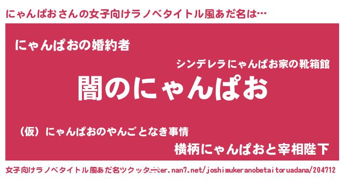 にゃんぱおさんの女子向けラノベタイトル風あだ名は… 『闇のにゃんぱお』『にゃんぱおの婚約者』『横柄にゃんぱおと宰相陛下』 ツクッター #女子向けラノベタイトル風あだ名ツクッター http://tkutter.nan7.net/joshimukeranobetaitoruadana/204712/
