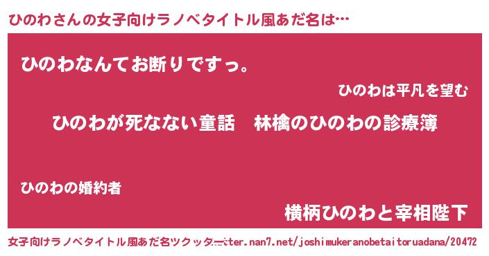 | 男性向けラノベタイトル風あだ名 | 『魔弾の王とひのわ』 |