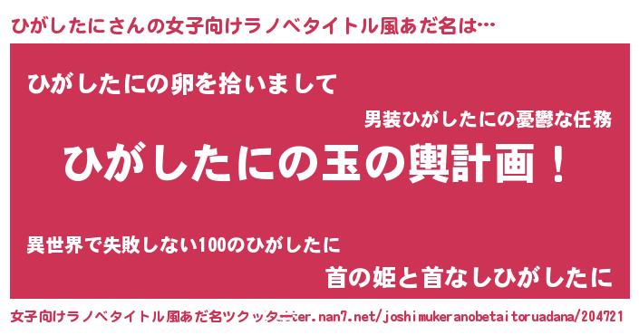男性向けラノベタイトル風あだ名 | 『ひがしたに~年齢イコール彼女いない歴の魔法使い~』 |