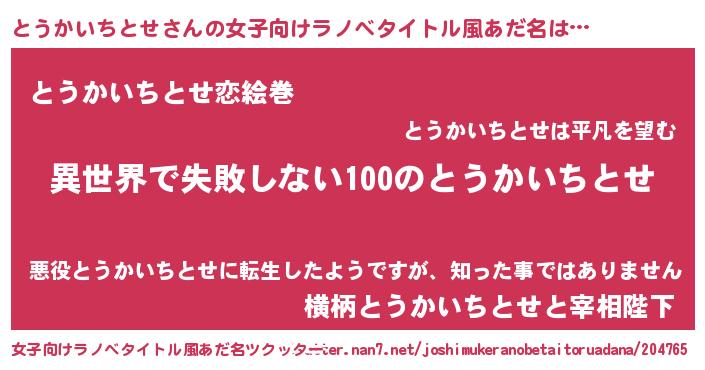 | 胡散臭い通販商品みたいなあだ名 | 『絶対に幸福をもたらす水素水…その名も「とうかいちとせ」』 |