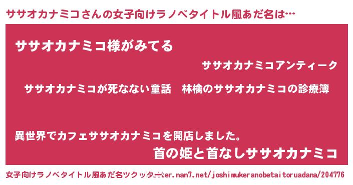 | 男性向けラノベタイトル風あだ名 | 『魔弾の王とササオカナミコ』 |