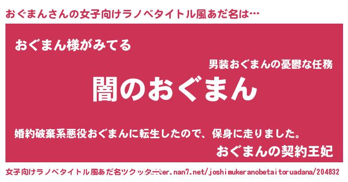 おぐまんさんの女子向けラノベタイトル風あだ名は… 『闇のおぐまん』『おぐまん様がみてる』『おぐまんの契約王妃』 ツクッター #女子向けラノベタイトル風あだ名ツクッター http://tkutter.nan7.net/joshimukeranobetaitoruadana/204832/