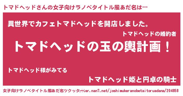 | 男性向けラノベタイトル風あだ名 | 『トマドヘッド~年齢イコール彼女いない歴の魔法使い~』 |