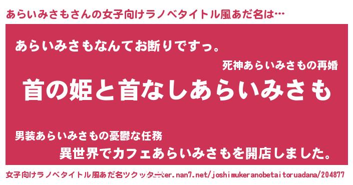 | ヘコむあだ名 | 『あらいみさも(苦笑)』『あらっ子』 |