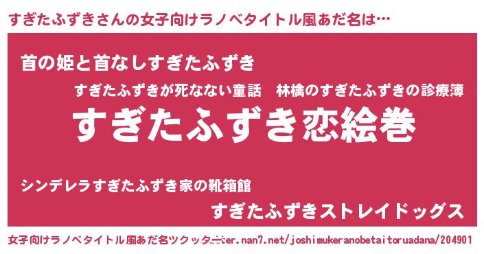 | 男性向けラノベタイトル風あだ名 | 『おまえをオタクにしてやるから、俺をすぎたふずきにしてくれ! 』 |