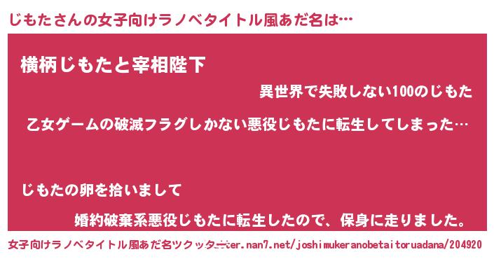 | 男性向けラノベタイトル風あだ名 | 『この素晴らしい世界にじもたを!』 |